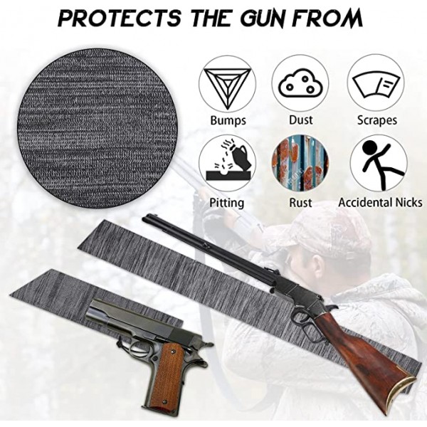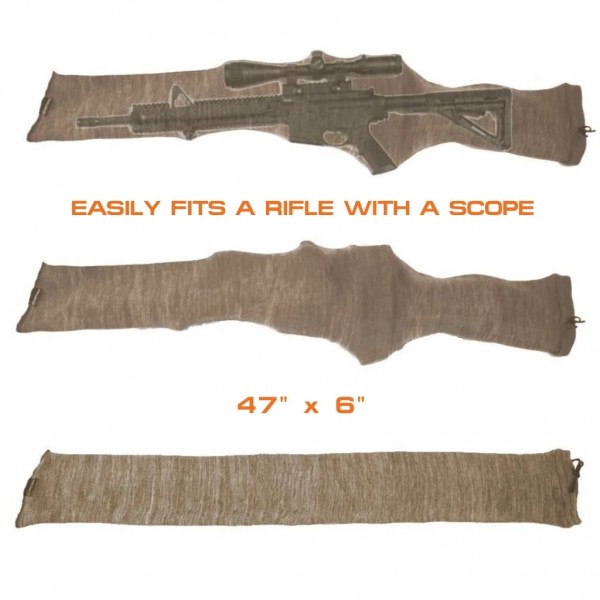 Whether you have a small arsenal at home or just keep a shotgun for security, storing firearms in high humidity has always been a challenge for gun owners. With humidity and moisture in the air, improper gun storage often results in rusted firearms – leading to thousands of dollars in damage and decreased home safety due to rusted, unusable guns.Gun Socks for Rifles/Shotguns were created to combat this pain point for gun owners. Our 100% silicone treated fabric doesn’t hold moisture like competitor gun sock sleeves and traditional gun storage materials such as foam, protecting your firearms from rusting during storage. The durable woven knit fabric of the Gun Socks for Shotguns/Rifles also keeps away scratches and dings during transportation and storage, designed for long-term, short-term, and in-transit storage with gun safes, gun cases, closets, bedrooms, and transporting firearms.NOTE: Clean and oil your rifles/shotguns as per manufacturer specifications to ensure there is no remaining moisture on the firearms before inserting them into the Gun Socks for Rifles/Shotguns for storage.