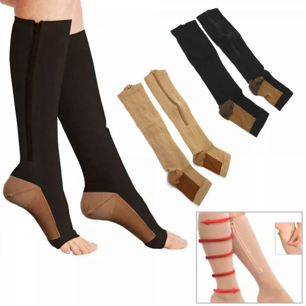 The Copper Infused Zippered Compression Socks are infused with copper and made to stabilize and support muscles and joints, as well as reduce swelling, enhance circulation, control odor and helps relieve archs and pain. The soft and comfortable Copper Infused Zip Up Compression Stockings are designed to increase blood circulation and reduce swelling. These compression socks with zipper are soft, breathable and comfortable compression pressure support socks are made with nylon and spandex for maximum comfort. Copper support hose are knee-high socks feature a pinch-resistant zipper that makes for easy wear & removal. The toe-less design accommodates large shoe sizes and provides quick access for all your needs. Compression rating of 15/20, Knee length, made from nylon and spandex.