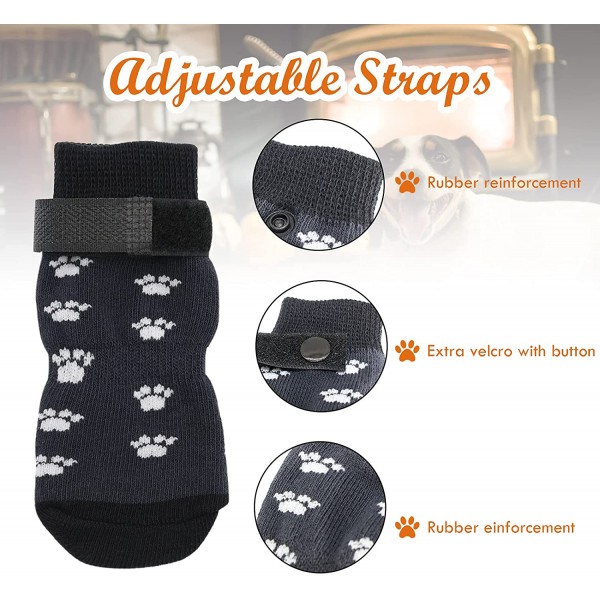 - FUNCTIONAL DESIGN: Firstly, extra elastic black loop fastener and grips design make your pet's paws tightly wrapped by the socks, fix it on the pet's feet all the time, never fall off easily. Besides, anti-slip silicon gel printed on the soles to provide extra traction, prevent your pet dogs from slipping and help them less inclined to fall.