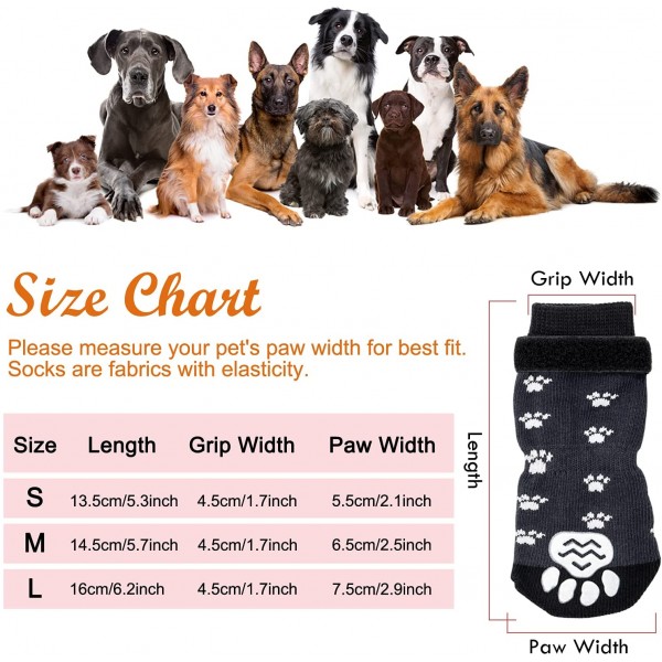 - COME IN 3 SIZES: Small girp width 1.7in, sock length 5.3in, paw width 2.1in. Medium girp width 1.7in, sock length 5.7in, paw width 2.5in. Large girp width 1.7in, sock length 6.2in, paw width 2.9in. Please measure your pet's paws carefully and choose the suitable one before ordering. If it is between the two sizes, it's better to choose the smaller size.