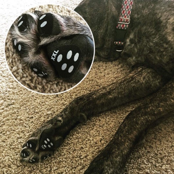 - If walking a lot outside and it’s wet out, the grip pads usually fall off on their own,wet and soap the paw and it comes off more easily.