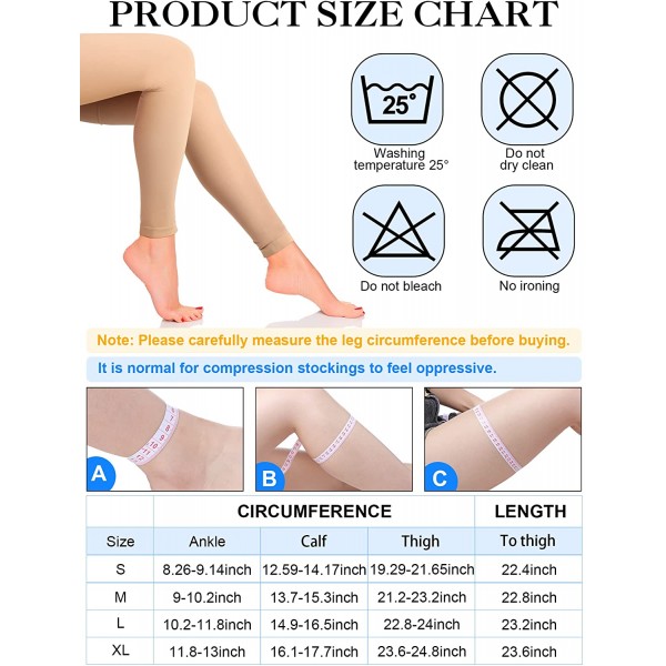- Graded compression: These thigh high elastic stockings can provide graded compression of 20-30 mmHg, and follow the pressure stage distribution, provide stable support, make them comfortable and safe to wear. Before buying, please carefully measure the leg circumference and choose the right size.