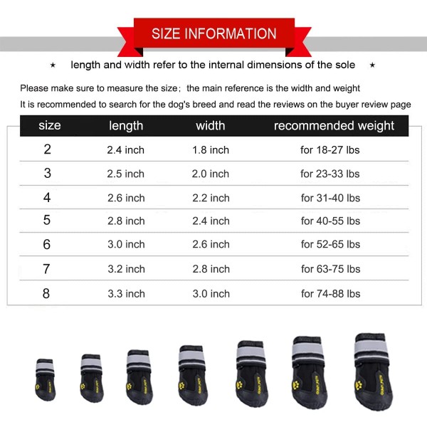 - Please mainly refer to the width, weight can only be used as an additional reference; Size 2: 1.8''x2.4''(W*L) for 18-27 lbs; size 3: 2.0''x2.5''(W*L) for 23-33 lb; size 4: 2.2''x2.6''(W*L) for 31-40 lbs; size 5: 2.4''x2.8''(W*L) for 40-55 lbs; size 6: 2.6''x3.0''(W*L) for 52-65 lbs; size 7: 2.8''x3.2"(W*L) for 63-75 lbs; size 8: 3.0''x3.3"(W*L) for 74-88 lbs. Measurements refer to the inside dimensions of the shoe, please choose the corresponding size for the width of the dog's paws.
