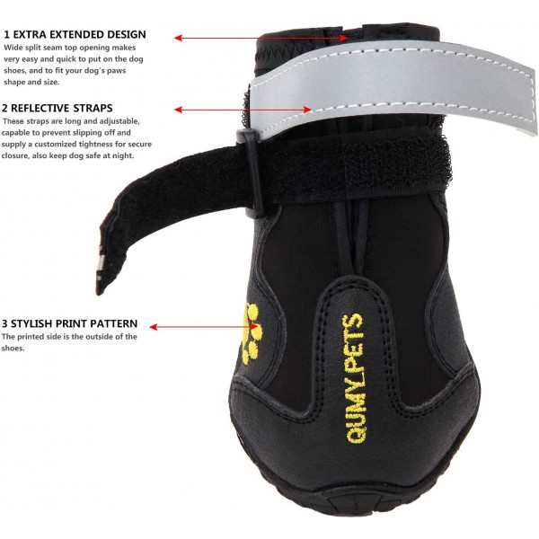 - SECURE and ADJUSTABLE: Easy to put on / off. These dog shoes expands with a wide split seam opening and two adjustable and reflective straps to ensure a tight fit, also make your dog safe at night.