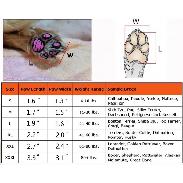 - Choosing Correctly Size - First Measuring the dog paws' size, if it is between two sizes as per our Size Chart,then select the larger one;Or even smaller one can use them too,as there are two ways of apply.