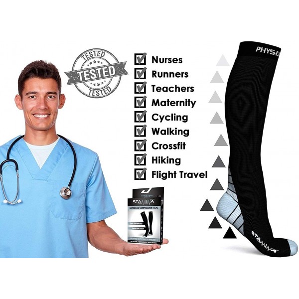 - STYLE AND CONFIDENCE ON YOUR LEGS Finally! A Durable Compression Sock designed to last, without compromising quality or Comfort. Double stitched Fabric your legs will thank you. Feel the immediate Comfort and remarkable design of your new Stamina Long Sock Tights. The Perfect Work, Cycling, or Ski Socks. Quality stitched & Easy to get on even though they are a compression sock! They Wash well without losing compression keeping all the Excellent vascular toning benefits.
