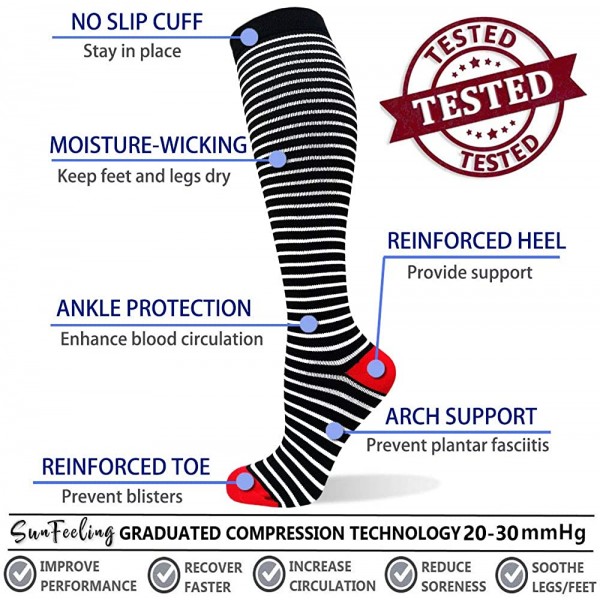 - BETTER FITTING - Our compression socks (20-30 mmHg) are recommended by doctors and preferred by trainers. Breathable high performance fabric wicks moisture away from your skin to ensure you feel fresh and comfortable. They are designed to promote blood circulation and oxygen flow reducing fatigue, swelling and helps in muscle recovery and varicose vein. Help relieve pain & discomfort related to plantar fasciitis, a LONG TERM Solution no overnight quick fix.