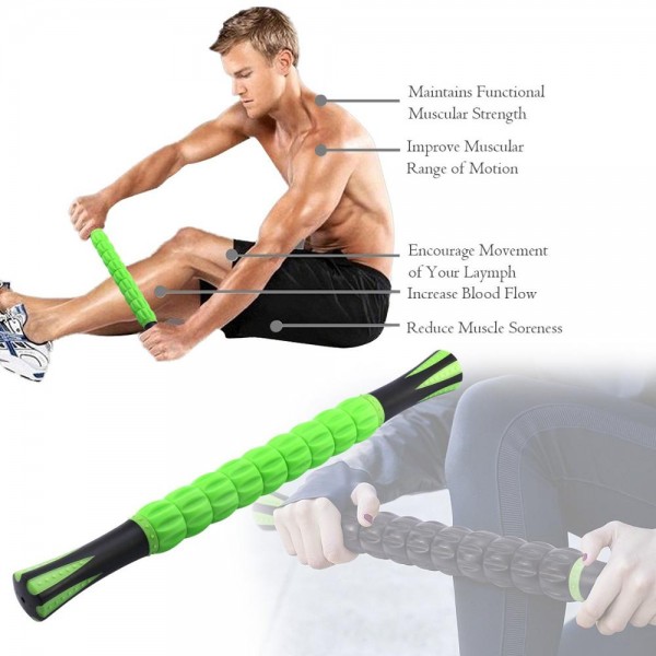Muscle massage roller helps break up fascia to relieve soreness and aid in muscle recovery.