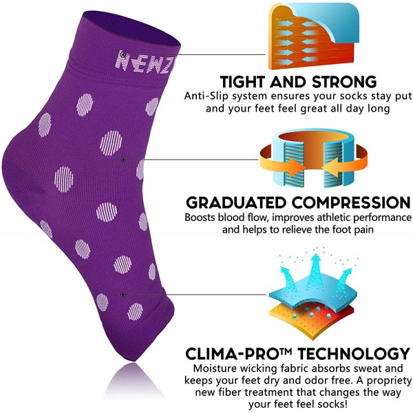 - CLIMA-PRO TECHNOLOGY – Our ankle sleeves provide superior relief of plantar fasciitis, heel spurs, ankle/arch support, and foot pain. They can help to reduce blood pooling and banish discomfort, as well as help with Achilles tendonitis, edema relief, and heel pain. Our compression socks can be worn after a rigorous activity to help your feet recover and to reduce swelling and soreness in the foot, ankle, and lower leg.
