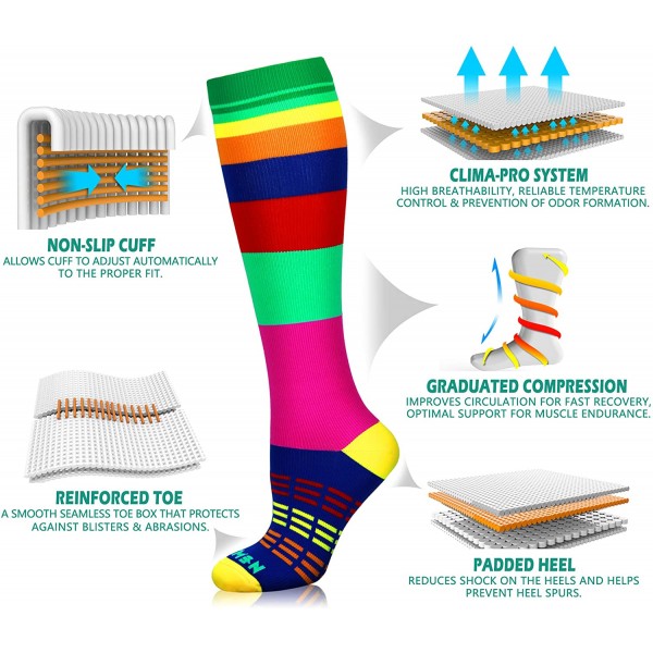 - PROMOTES BLOOD FLOW & CIRCULATION – Compression (20-30 mmHg) Socks deploy "graduated" compression—they squeeze more and more tightly the farther they are from the heart. These colorful compression socks can help reduce blood pooling in the legs and speed up the return of blood to the heart. Stimulating blood flow helps improve oxygen delivery to your muscles, which speeds up muscle recovery, helps prevent cramping, swelling, spider veins, and circulation issues common among diabetics.