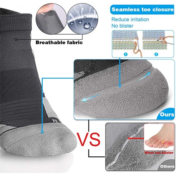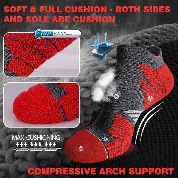 - Anti-blister Cushioning and Compressive Arch Support: No show cushion padded socks can make feet comfort and relaxed (absorb impact and relieve foot fatigue) to promise no blisters after long time work. Compression arch support keeps runners’ arch stable and secure fit, reducing fascia fatigue while running