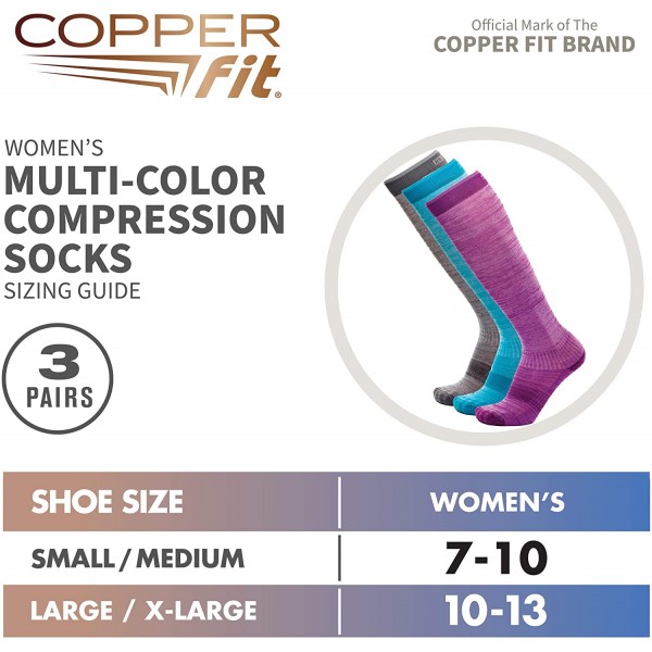 - Each box contains 3 pairs of Energy Women's Easy-On/Easy-Off Knee High Compression Socks, Taupe Gray, Cyan Blue, Magenta Pink, Small/Medium.