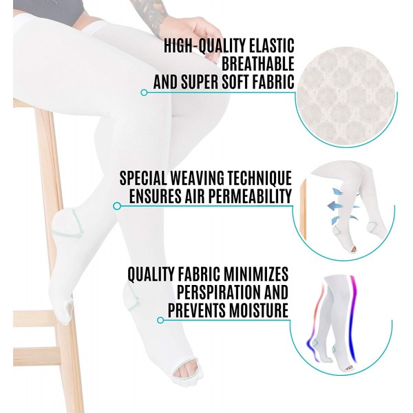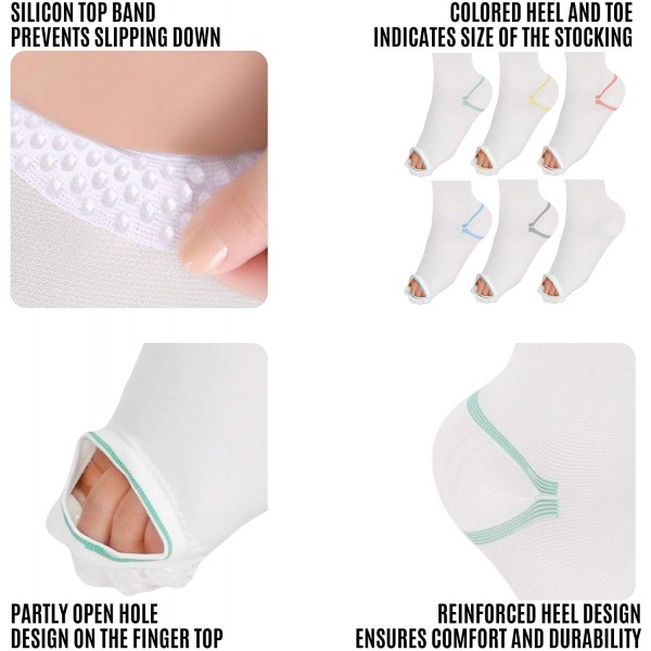 - ANTI SLIP TOP BAND There is a silicone top band on the upper top of the stockings. It will prevent slipping off and will give you the ease of use. Thanks to these top bands with silicone dots, this compression sock will remain steady during day and night. There is an inspection hole on the front toe part of the compression stockings. The toe part of the ted hose is not fully opened, there is just a small hole on the top of your finger part. This will allow inspection and ensures compression.