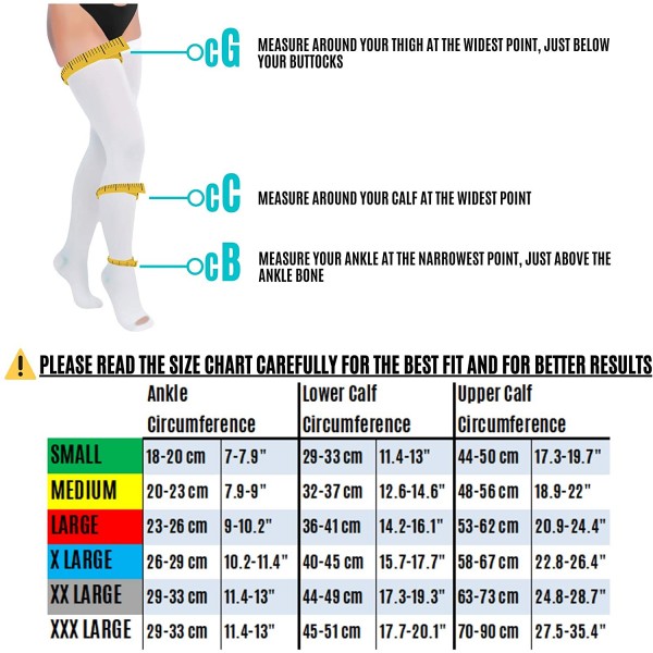 - PLEASE READ THE SIZE CHART Color on the socks will indicate the size of the socks. Before ordering, please measure your leg size correctly. This is a unisex post surgery compression garment (medias de compresion). These thigh high embolism socks will give you great support for your upper and lower legs. No more leg fatigues and cramps anymore. Unisex compression stockings accelerate blood circulation and give you great relief. This is also great leg shapewear for leg slimming and tightening.